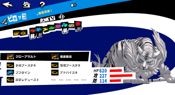 ビャッコは、ブフダインと物理技を持っており、途中で現れるプロジェクター(物理弱点)や剣(氷結弱点)の弱点を突ける対ミヤザワ戦には必須級のペルソナです。